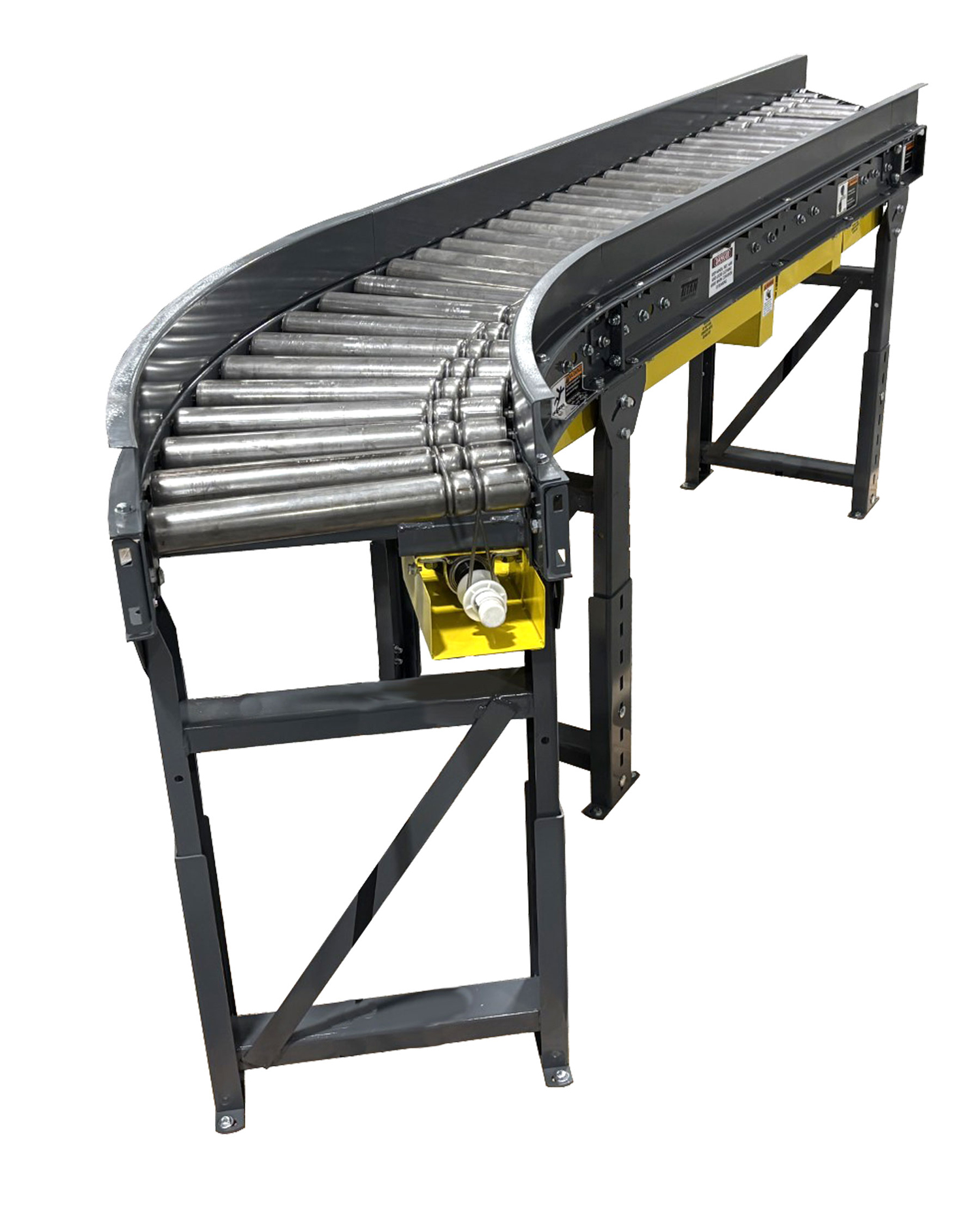 In addition to performing the standard functions of a conventional live roller conveyors it can easily be configured to solve a large variety of other special requirements, such as turning corners, lift, turn, rollover, transfer, upend, speed-up, slow down, brake, accumulate, sorting, providing dwell point work stations, 90 degree transfers, reversing, merging, diverting, from one central drive shaft. With most other types of conveyors, these extras would require special equipment, expensive design costs and multi drives.